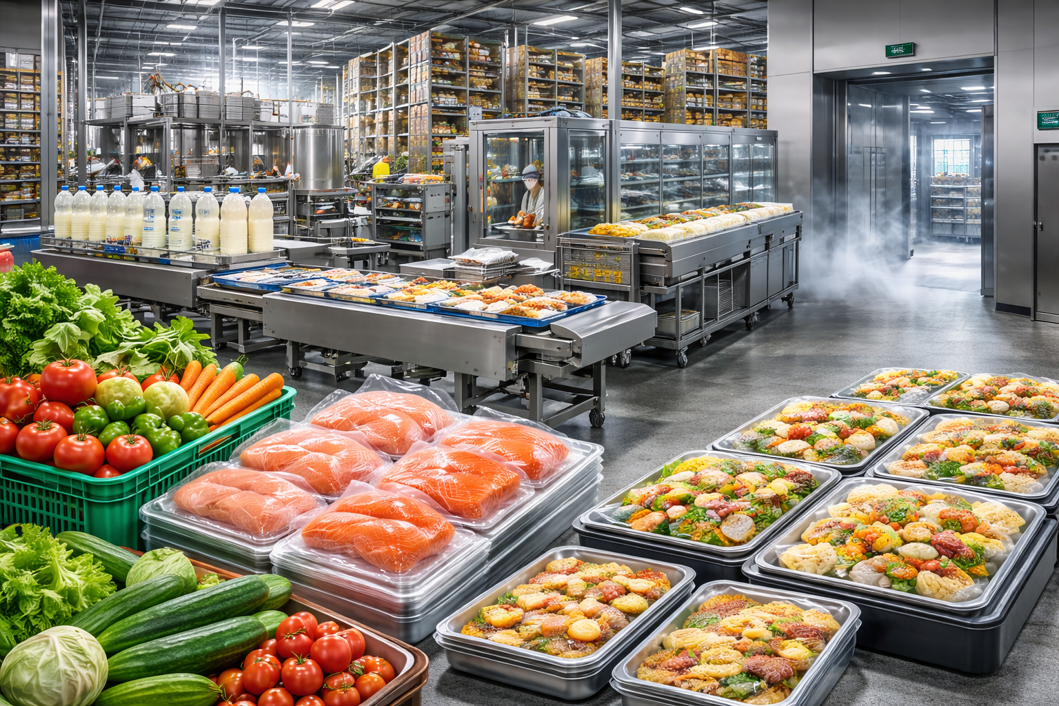 Food-related industrial setups including packaging lines, cold storage, fish processing, and post-harvest handling facilities.