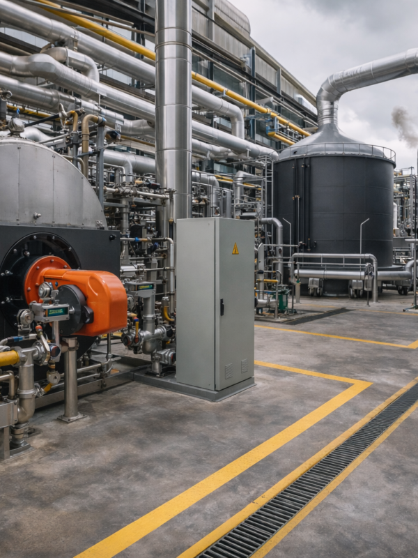 Cocoa processing operations are designed as resource-conscious industrial systems, integrating production equipment with supporting utilities and recovery loops.