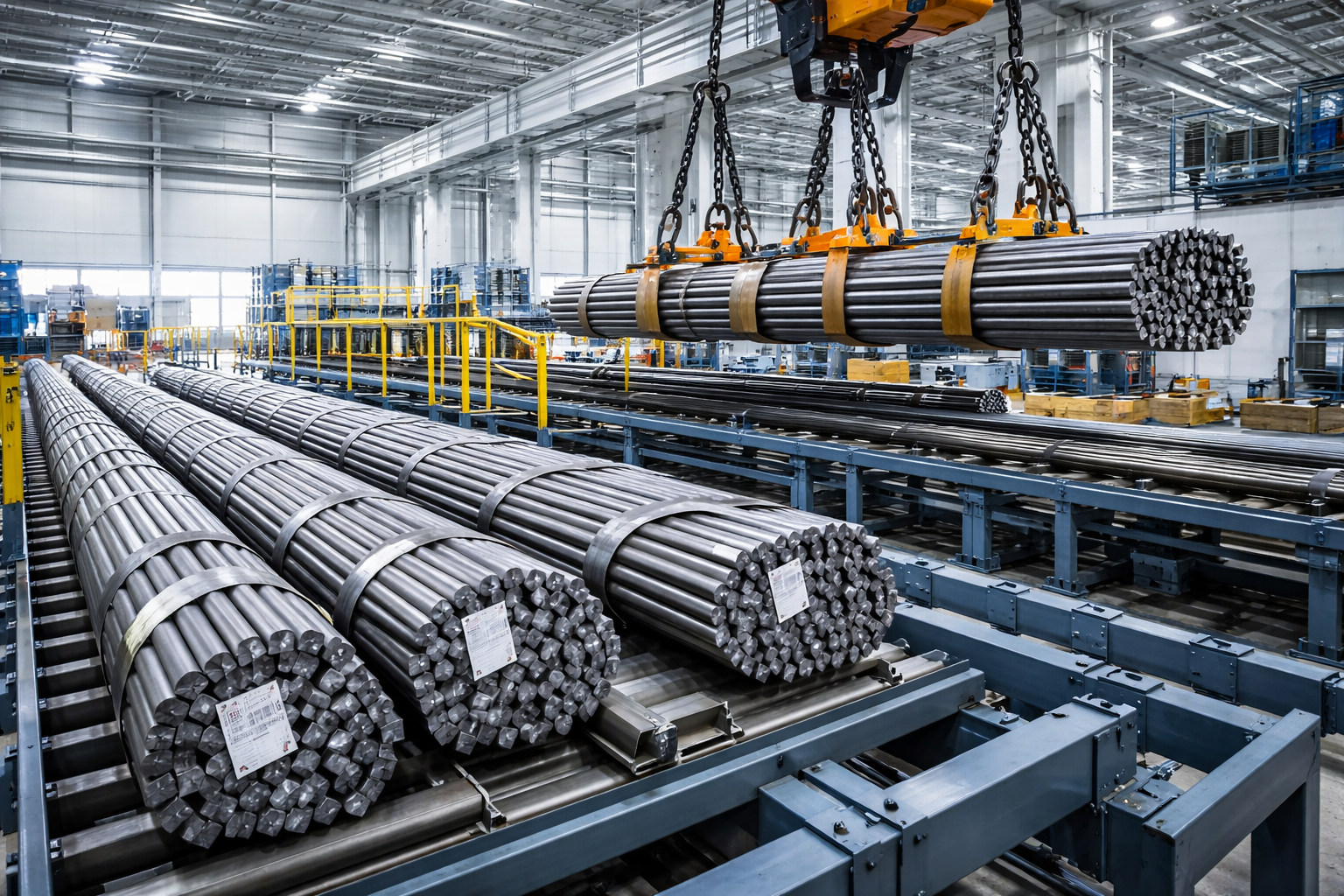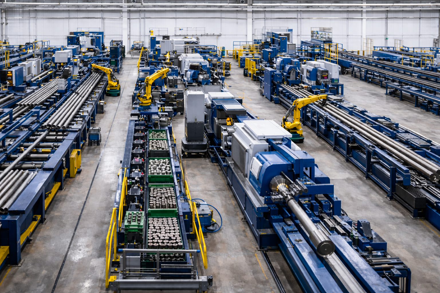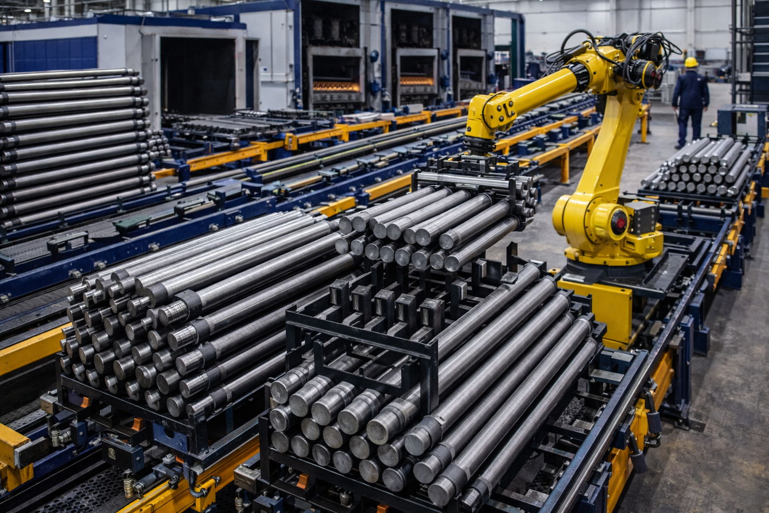 The manufacturing flow begins with the intake of steel bars and rod stock used for oil & gas components. These materials are received in defined lengths and diameters and transferred into horizontal storage systems designed for long, load-bearing parts. Handling equipment such as roller beds, cranes, or gantry systems ensures that components are moved without introducing deformation. At this stage, material identification and traceability are established
