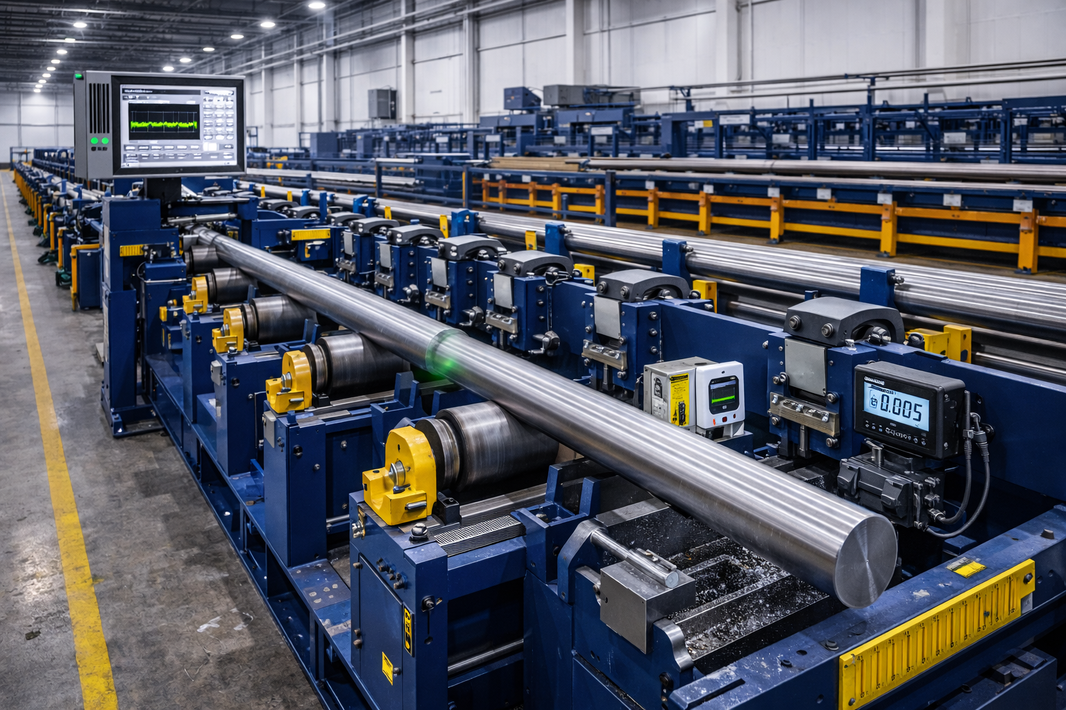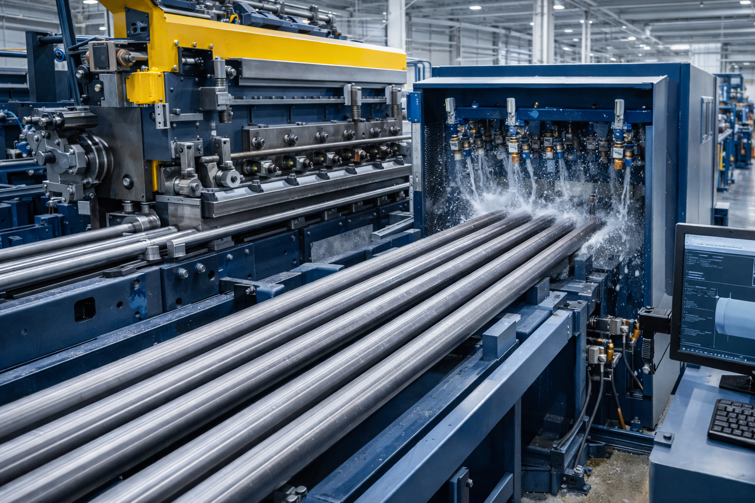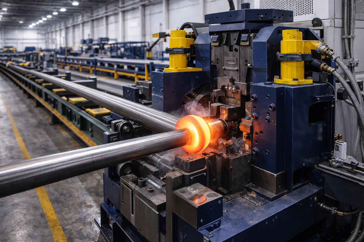 For manufacturers producing multiple component families, dedicated production lines are configured in parallel. Separate but coordinated lines may exist for rods, couplings, connectors, or shafts, each optimized for its specific process sequence. Material flow between machines is managed through roller systems, transfer units, and limited robotic assistance, supporting continuous production without excessive automation complexity.