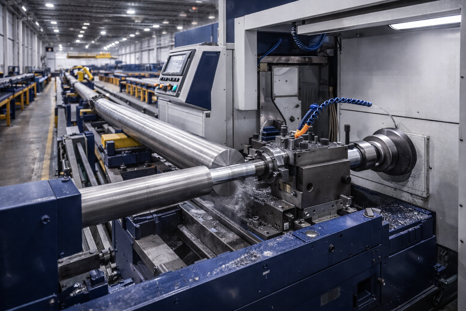 Machining operations refine component geometry to meet tight dimensional tolerances. Long-bed CNC lathes and turning centers process elongated parts by machining outer diameters, shoulders, and functional surfaces. Controlled coolant systems and in-process measurement support consistent results across serial production, ensuring dimensional stability and surface quality.