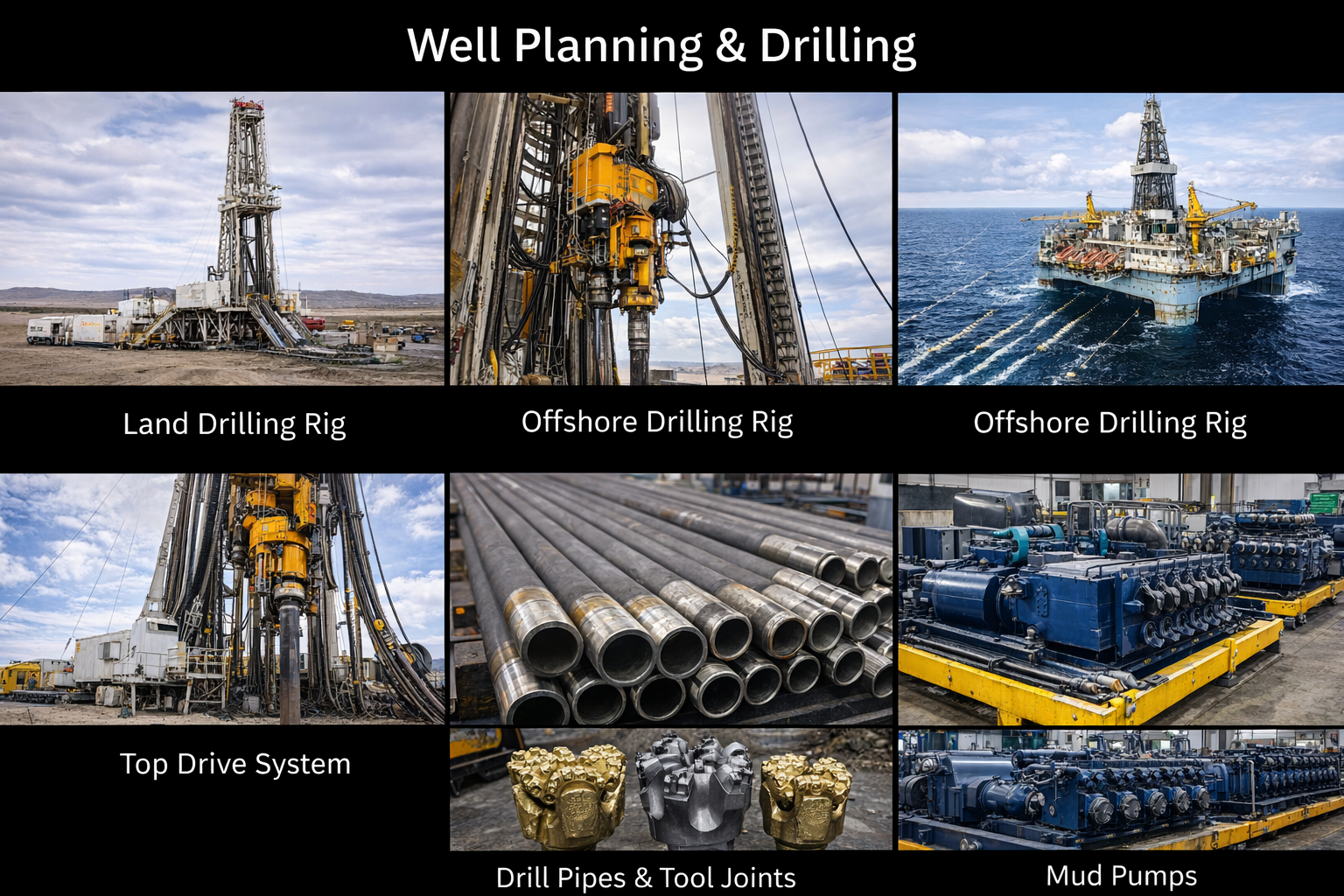 Drilling operations are executed using land and offshore drilling rigs equipped with top drive systems, drill pipes, tool joints, drill bits, and high-pressure mud pumps. These systems work together to safely drill wells to target depth while managing torque, load, and downhole conditions.