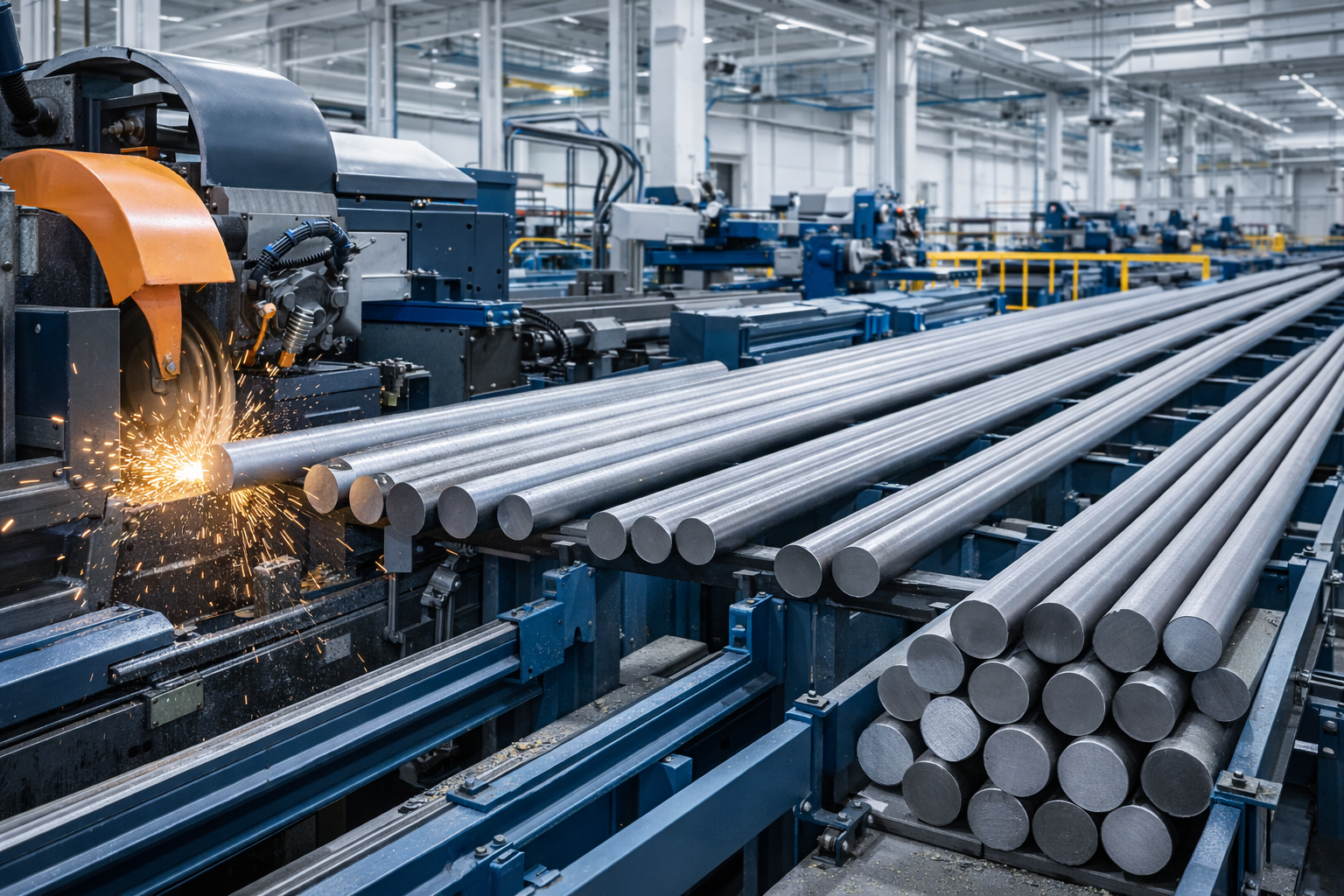 The manufacturing flow begins with the intake of steel bars and rod stock used for oil & gas components. These materials are received in defined lengths and diameters and transferred into horizontal storage systems designed for long, load-bearing parts. Handling equipment such as roller beds, cranes, or gantry systems ensures that components are moved without introducing deformation.