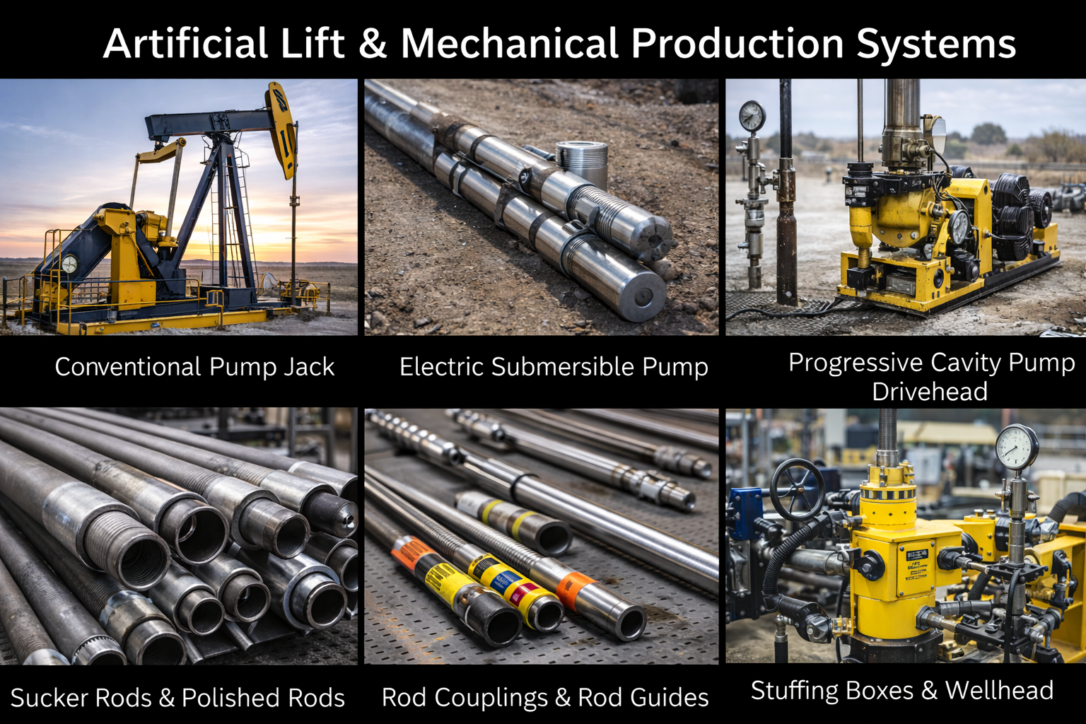 Mechanical production systems lift oil to the surface using pumpjack units, sucker rods, polished rods, rod couplings, electric submersible pumps, progressive cavity pumps, gas lift valves, and wellhead control systems supported by monitoring and control equipment.