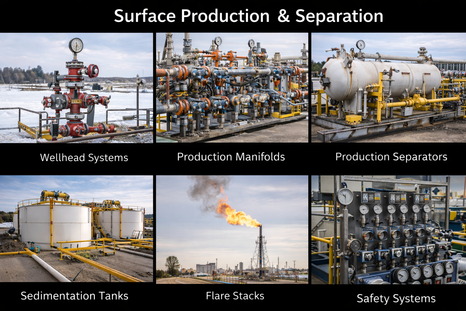 At surface facilities, produced fluids flow through wellhead systems, production manifolds, separators, sedimentation tanks, flare stacks, and safety systems. These units separate oil, gas, and water while maintaining pressure control