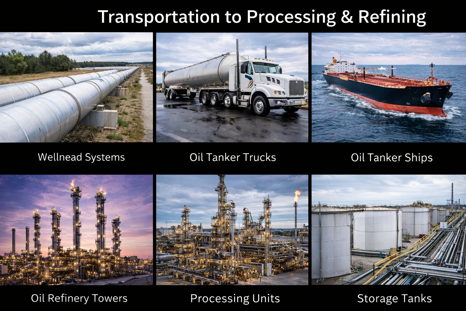 Produced oil is transported via pipelines, tanker trucks, and tanker ships to processing facilities and refineries. Refinery towers, processing units, and storage tanks handle large-scale treatment, refining, and storage before distribution to end markets.
